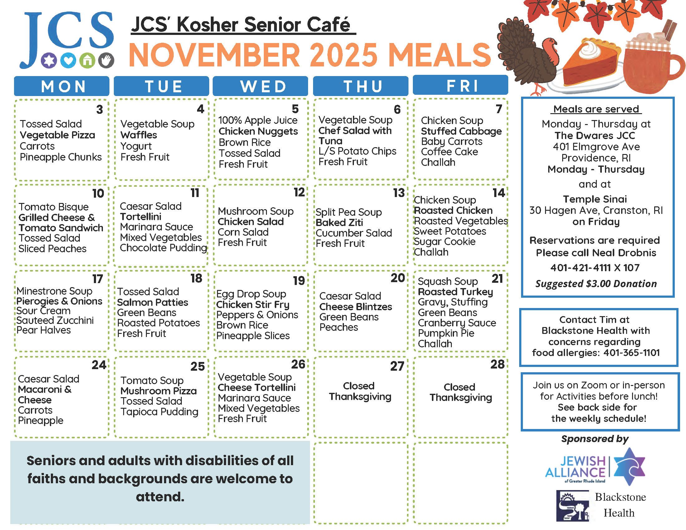 In partnership with Jewish Collaborative Services (JCS), Senior Café offers kosher meals for seniors at two convenient locations and Kosher Meals on Wheels is available to homebound seniors and people with disabilities. Seniors 60+ and people with disabilities of any age are welcome to dine, listen, learn, and socialize.