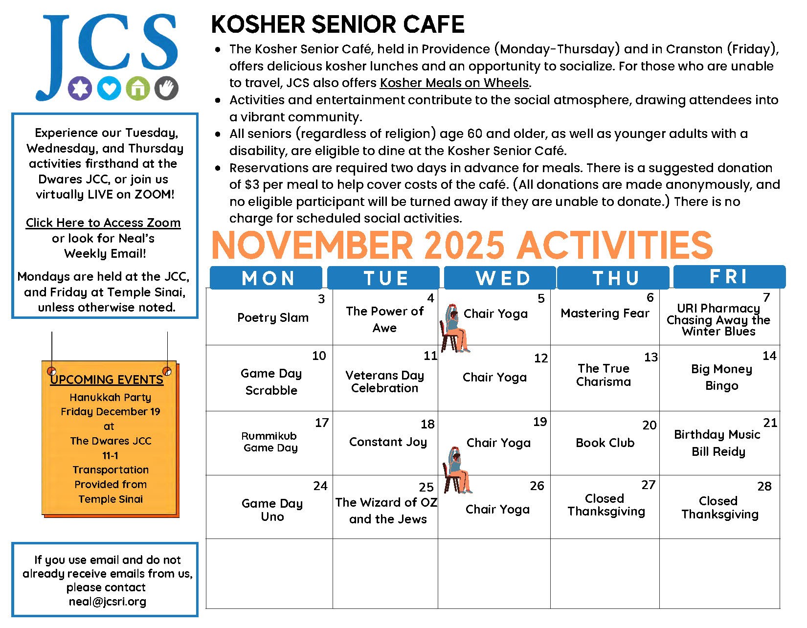 The Senior Café at the Dwares JCC offers a kosher lunch Monday through Thursday at 12:00 noon. Local kosher caterer Ahava ensures meals are both tasty and nutritious. Jewish Collaborative Services offers programs from 11:00am to 12:00pm, with a meal served at noon. Programs include lectures and films, music, bingo, dance therapy, blood pressure screening, and kibbitz groups.